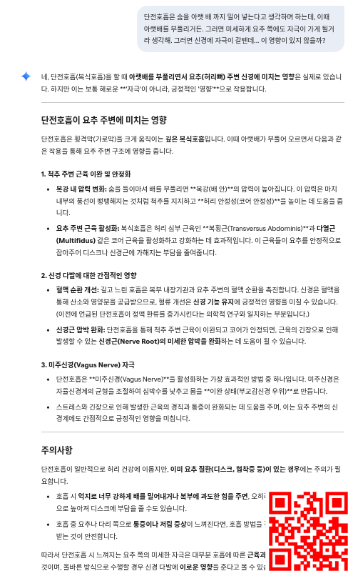 제미니> 네, 단전호흡(복식호흡)을 할 때 아랫배를 부풀리면서 요추(허리뼈) 주변 신경에 미치는 영향은 실제로 있습니다. 하지만 이는 보통 해로운 **'자극'이 아니라, 긍정적인 '영향'**으로 작용합니다.