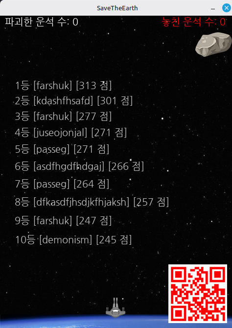- 운석을 맞춘 갯수는 점수가 되고, 그것을 서버에 저장하고 1등 ~ 10 등 까지 보여준다.